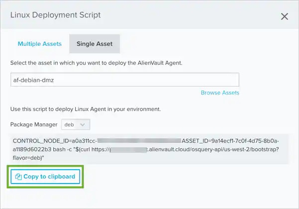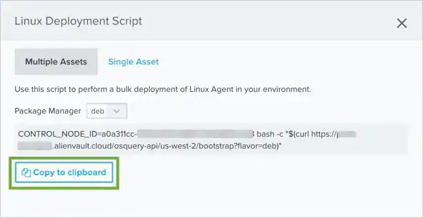 Note: If you use a multiple asset installation script to execute bulk deployment across multiple host systems, the script will not have the unique asset ID. In this case, USM Anywhere attempts to associate the LevelBlue Agent with an existing asset if there is enough information and it can make a definitive match. When a deployed agent does not have an associated asset, you must manually make this association in USM Anywhere to enable queries and log collection for the host system. See LevelBlue Agent and Asset Associations for more information.
