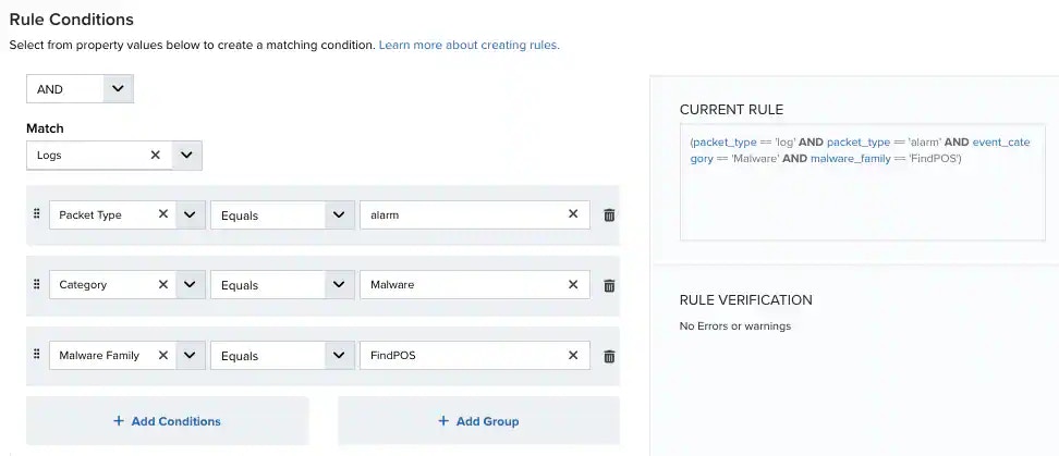 Select an operator and add one or more conditions to form the conditional expression. You can include a condition group to evaluate a subset of conditions. The Current Rule pane displays the constructed expression in standard syntax. The box displays a red border if the expression is syntactically invalid as currently specified. A valid expression is required to save the rule definition.Select the operator used to determine the match for multiple conditions:- AND: Match all conditions.