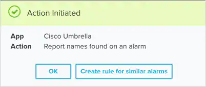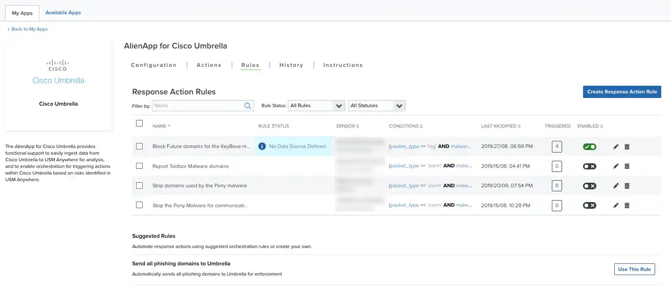 - On the Rules tab of the BlueApp page: This tab provides various tools that you can use to create and manage the orchestration rules that use the BlueApp for Cisco Umbrella actions. For easy rule creation, you can use a suggested rule as the basis for the new orchestration rule. This tab also provides a method to easily create a new rule based on your own matching criteria where the sensor and app are already selected, and displays all rules associated with the BlueApp so that you can easily enable or disable rules as needed.