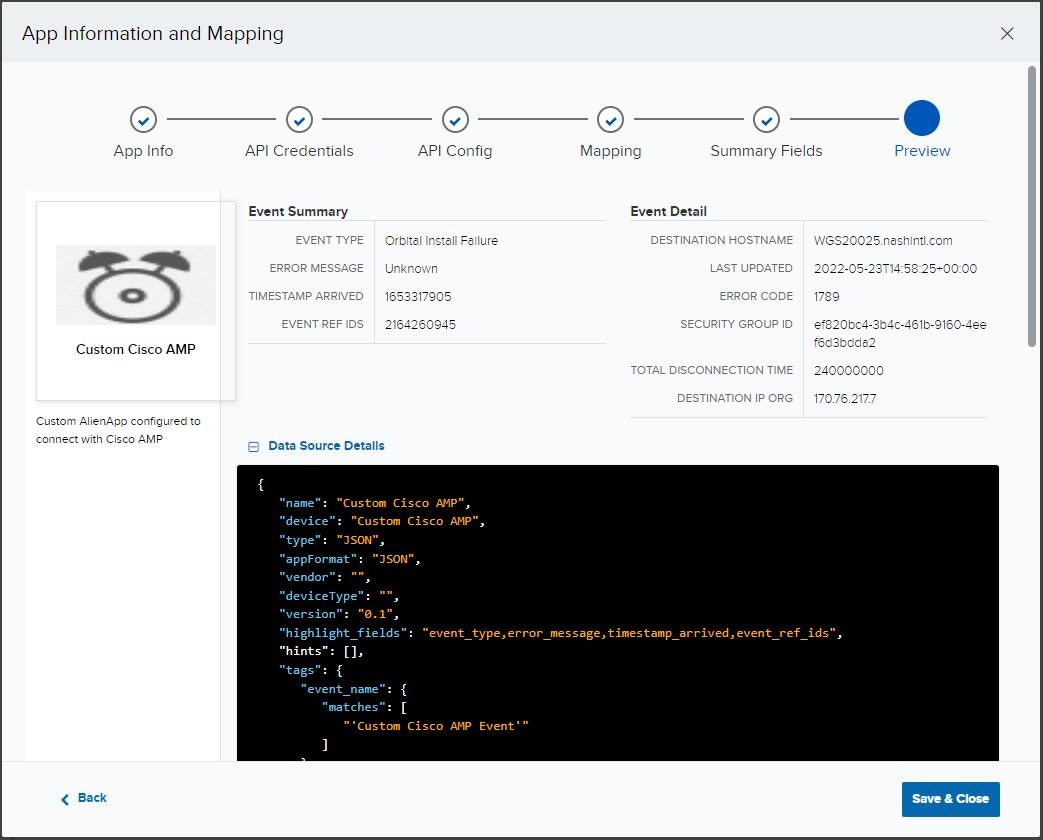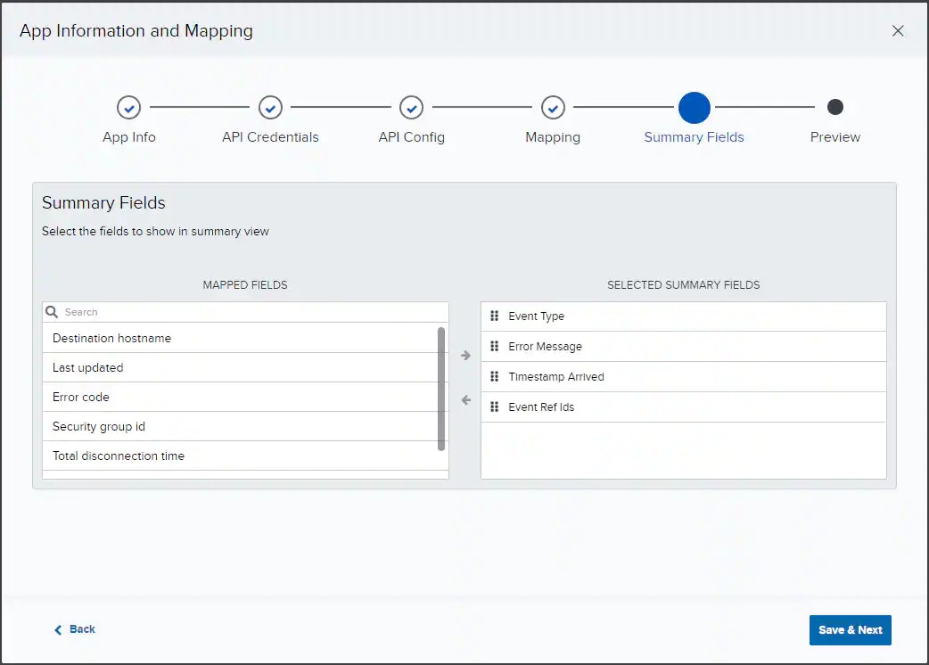 USM Anywhere uses the configuration details from the previous two steps to connect with your third party and extract data fields found in the logs they send. Use this page to configure the mapping details between the third-party application’s data fields and fields in USM Anywhere by dragging and dropping from the detected fields to their matching fields in USM Anywhere.