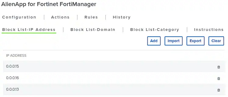 The external block lists for IP addresses, domains, and categories, are all contained in the BlueApp for Fortinet FortiManager page (Data Sources > AlienApps > Fortinet FortiManager). For each tab, you can see the list of all the items on the block list, and you can remove individual items by clicking the icon next to the item. Each tab also contains three buttons above the list:- Add: Opens a dialog box to add an IP address, domain, or category to the list.