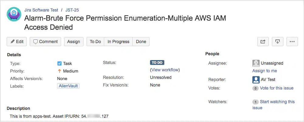 - Click the Issues tab. The displayed list includes all Jira issues generated by USM Anywhere, with the most recently opened issues at the top. Here you can view the status and assignment for the issue as reported by your Jira instance.