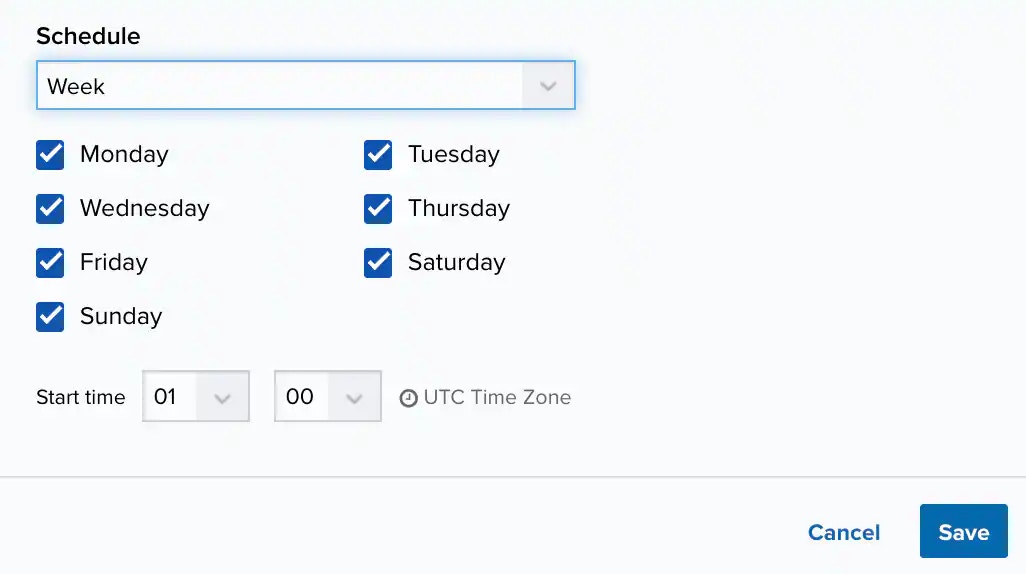 c. Set the start time. This is the time that the job starts at the specified interval. It uses the time zone configured for your USM Anywhere instance (the default is Coordinated Universal Time [UTC]).Important: USM Anywhere restarts the schedule on the first day of the month if the option “Every x days” is selected. - Click Save.