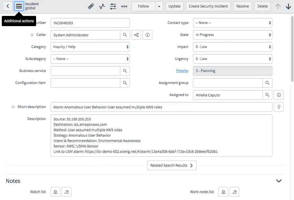 In ServiceNow, you can assign the issue, change its status, access the source of the incident in USM Anywhere from the link included in the ServiceNow incident, or perform any of the functions supported for your account.