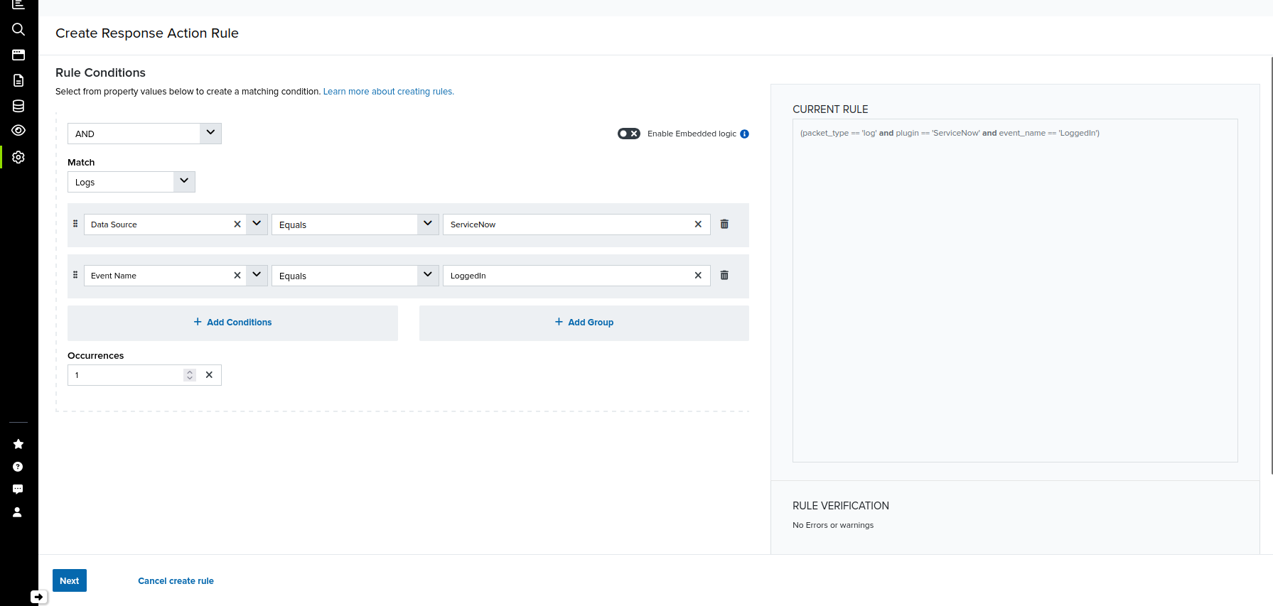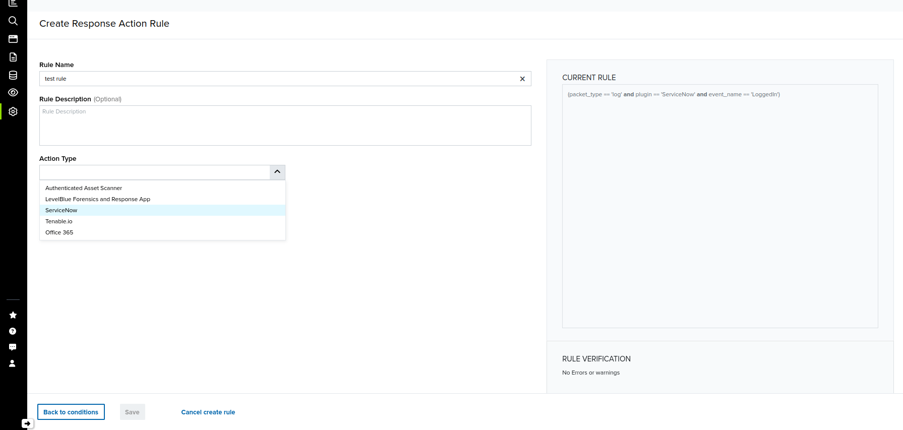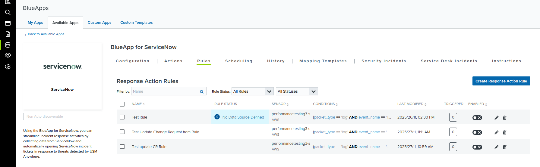 Before creating a ServiceNow response action rule, the BlueApp for ServiceNow must be enabled and connected to your ServiceNow instance. See Configuring the BlueApp for ServiceNow for more information.
