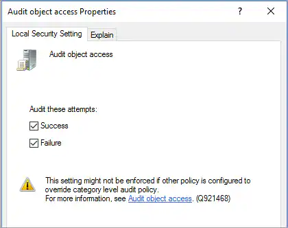 In the dialog, select the Success and Failure check boxes to enable auditing.