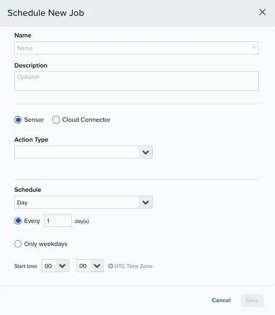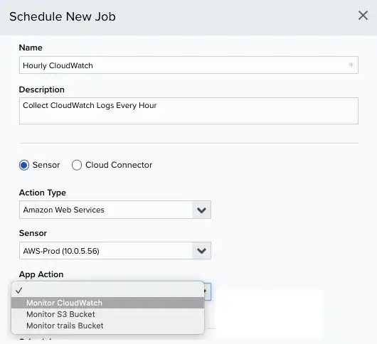 The Schedule New Job dialog box opens.Note: If you have recently deployed a new USM Anywhere Sensor, it can take up to 20 minutes for USM Anywhere to discover the various log sources. After it discovers the logs, you must manually enable the AWS log collection jobs you want before the system collects the log data.