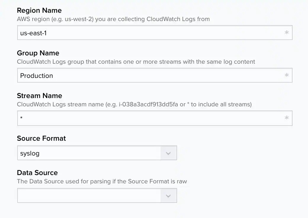 - Enter the Region Name, Group Name, and Stream Name information for your AWS account. Region name can be an asterisk ( * ) to monitor all regions for a given group.