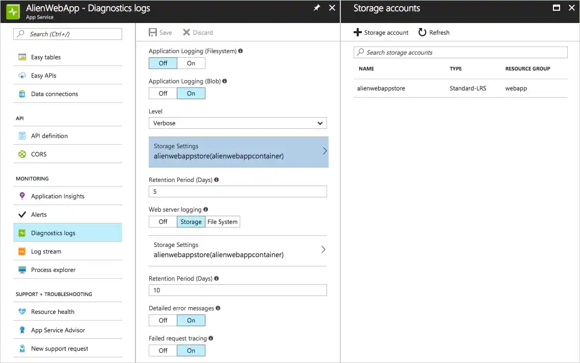 - Go to your Azure Web App and select Settings > Diagnostics logs.