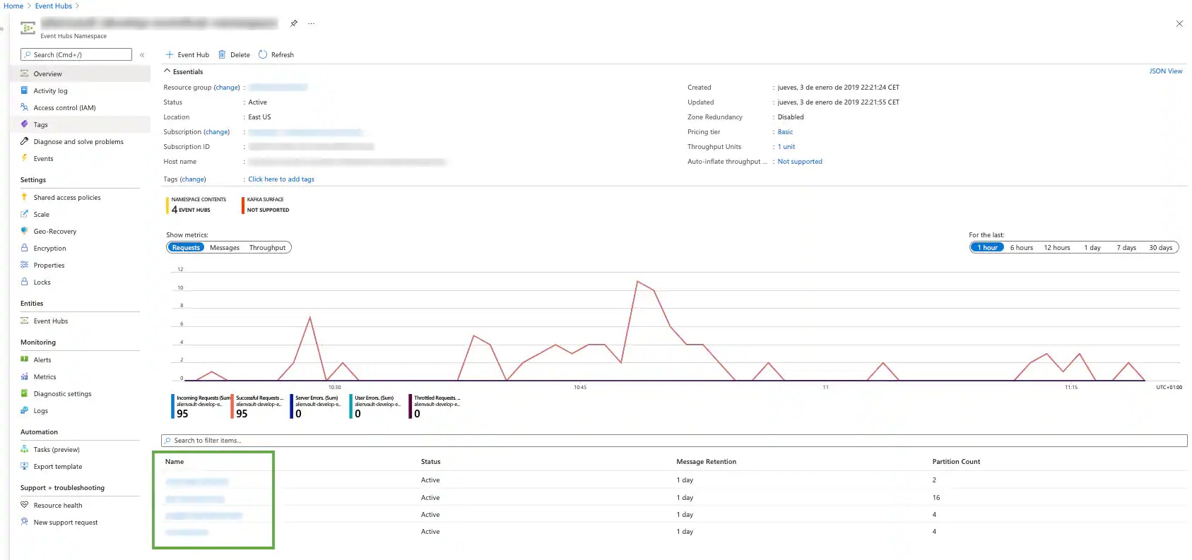 - Event Hub Consumer Group: The name of your Event Hubs consumer group. You can locate this name by opening your Event Hubs overview in the Azure portal and scrolling to the bottom of the page.