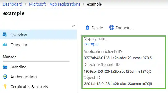 After the application is created, you can locate the application(client) ID, directory (tenant) ID, and object ID needed to complete the Azure Credentials step of the sensor setup in USM Anywhere.