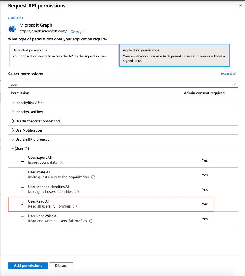 Select Application permissions and then User.Read.All. Use the search function to help locate the permissions.