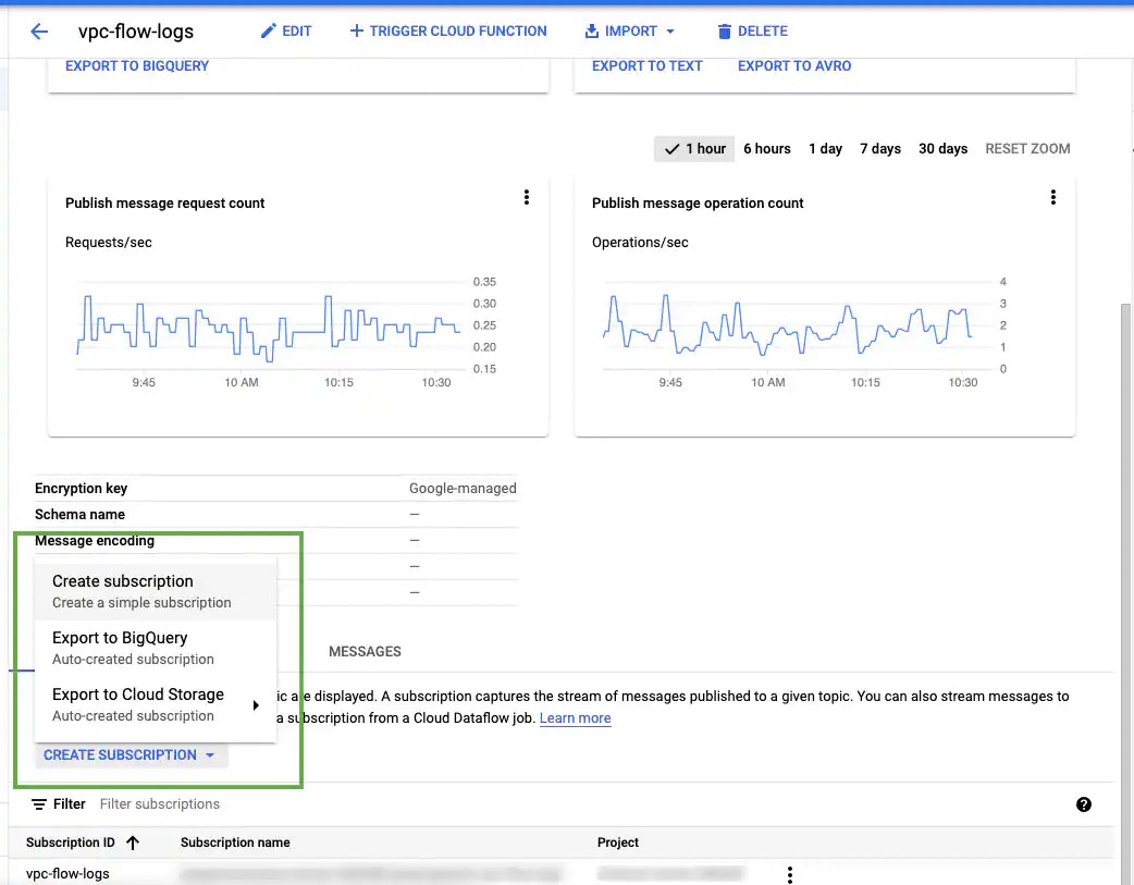 By default, the Add a default subscription checkbox is selected. The subscription for this topic will be automatically created using the default settings. Its name is [topic]-sub (for example, MyTopic-sub). If you leave this checkbox deselected, you will need to create a subscription. See To create a subscription for a Cloud Pub/Sub topic for more information.Note: Make note of this name, as you will need to reference it when creating your export sinks.