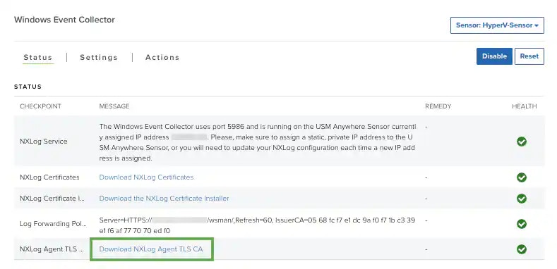 To use TLS, you need to download the certificate and save the fileUSM-NXLog-Agent-TLS-CA.pemin the\nxlog\cert\directory on your machine.- Go to Data Sources > Sensors.