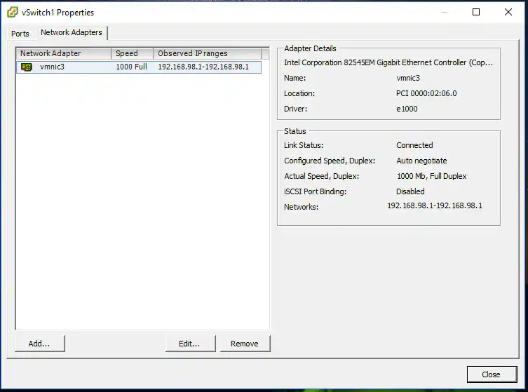 e. Select the Network Adapters tab and make sure that your spare NIC is associated with the vSwitch.