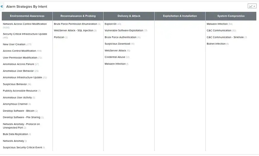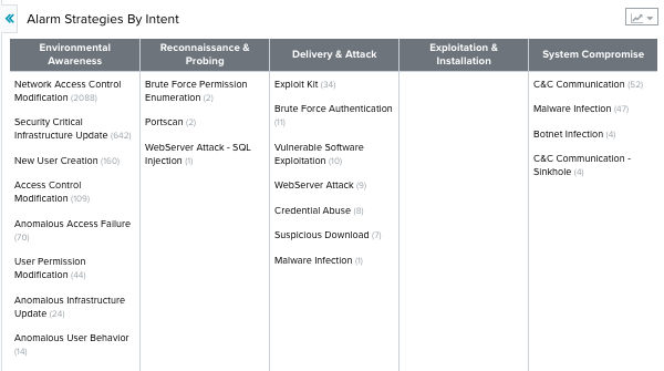 The graph at the top of the Alarms page provides a graphical representation of alarms by intent. The blue circles indicate the number of times that an alarm in an intent occurred. A bigger circle indicates a higher number of alarms. You can hover over each of the circles to get the actual number of alarms per intent. In addition, clicking a blue circle displays a list of only the alarms corresponding to that circle. You can change the displayed period of time by clicking the Last 24 Hours filter. Alarms graphed by intent are sorted into five different categories, which are represented by the graphic icons in the display:- Delivery & Attack (
