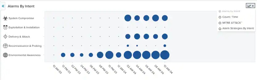 - Alarms by Intent: This view is a bubble graph that provides a graphical representation of alarms by intent.