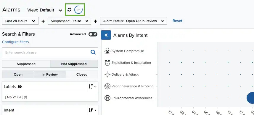USM Anywhere gives you the option of refreshing the page automatically in a period of time that you can configure. There is an auto-refresh countdown that refreshes the page at a regular interval. The number inside the blue circle indicates the remaining time until the next refresh. See Select the Time for Auto-Refreshing the Alarms and Dashboard Pages to configure this interval. You can click the