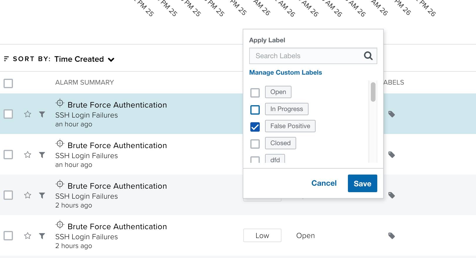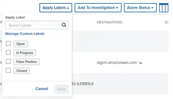 Select the checkbox to the left of an alarm, click Apply Labels, select the label, and click Save.