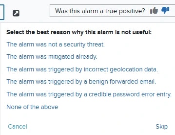 icon to apply an alarm outcome of True Positive or False Positive. If this alarm was a False Positive, select an optional reason from the drop-down list. Leave these icons unselected to retain a status of Undetermined.
