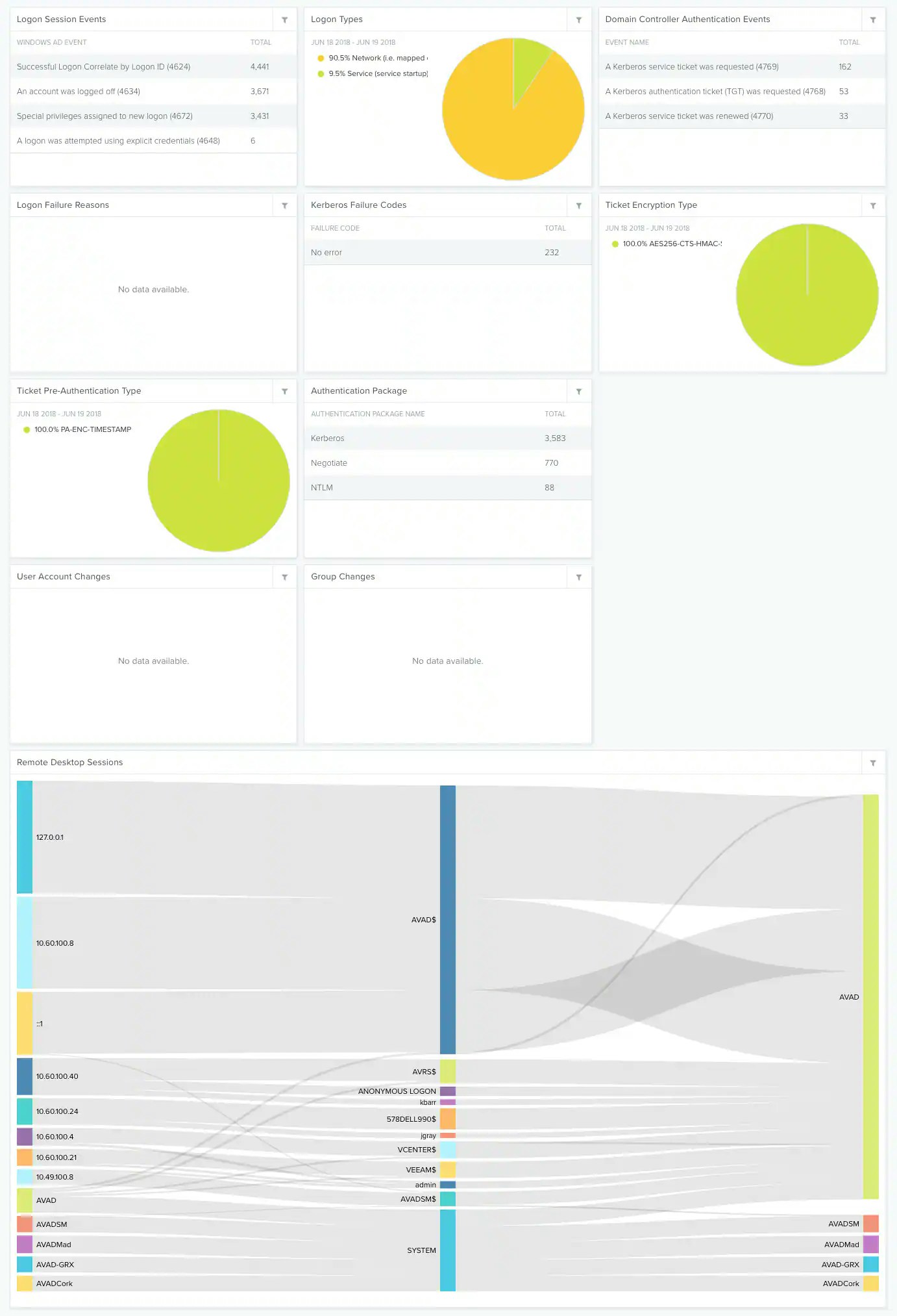 | Domain Controller Authentication Events | Top authentication events received by the Domain Controller. For example: Kerberos tickets of any type (authentication, services). |