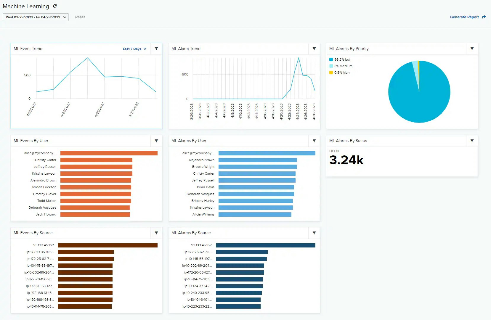 | ML Alarms By User | Displays users associated with the most alarms detected by machine learning |
