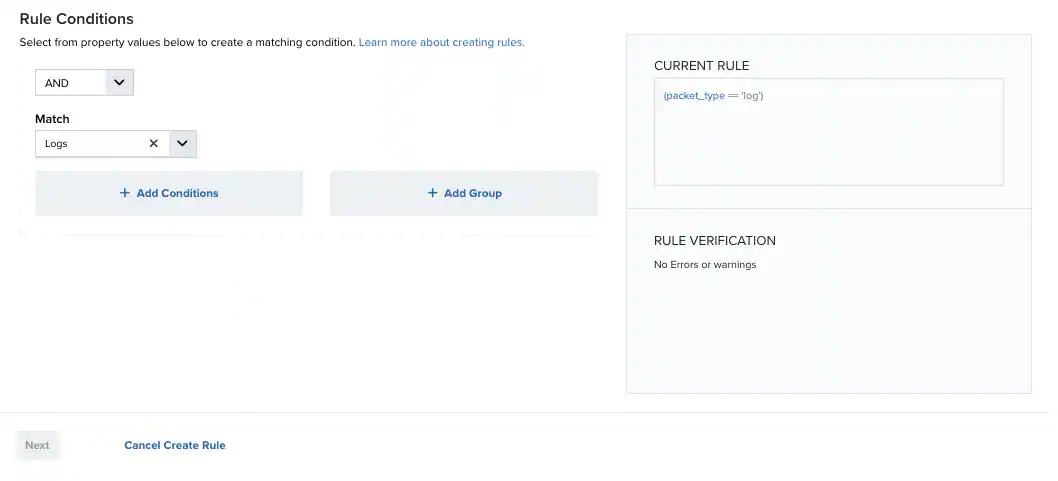 Click Add Conditions and select the property values you want to include in the rule to create a matching condition.