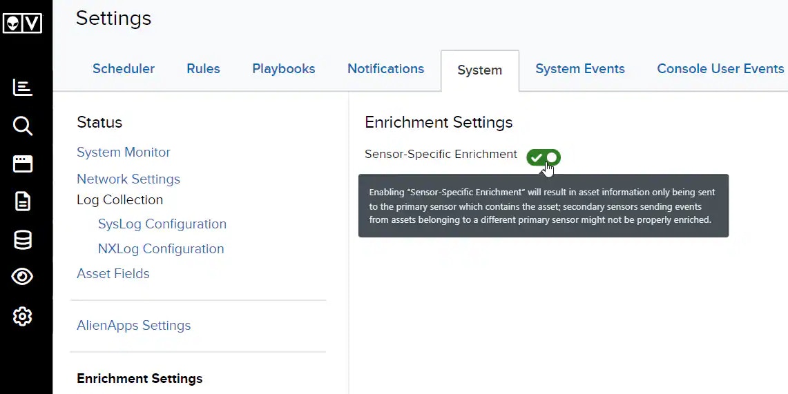 - Toggle on Sensor-Specific Enrichment. Enabling this option sends asset information exclusively to the asset’s primary sensor.