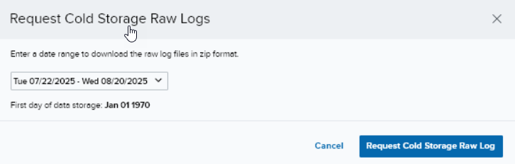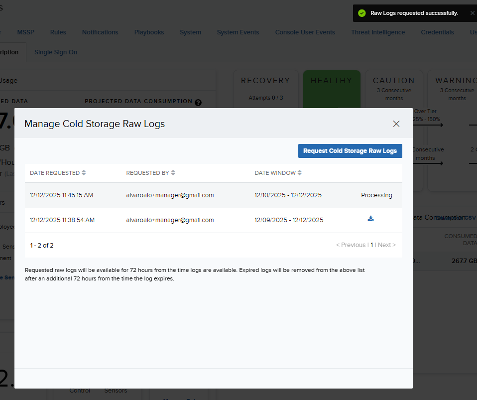 - Click Request Cold Storage Raw Log. A message will be displayed indicating that a new request has been triggered, and the request will be displayed among the list of requests made. As the user who requested the raw logs, you will be sent an email to download the logs.