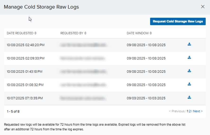 - Click Request Cold Storage Raw Logs.