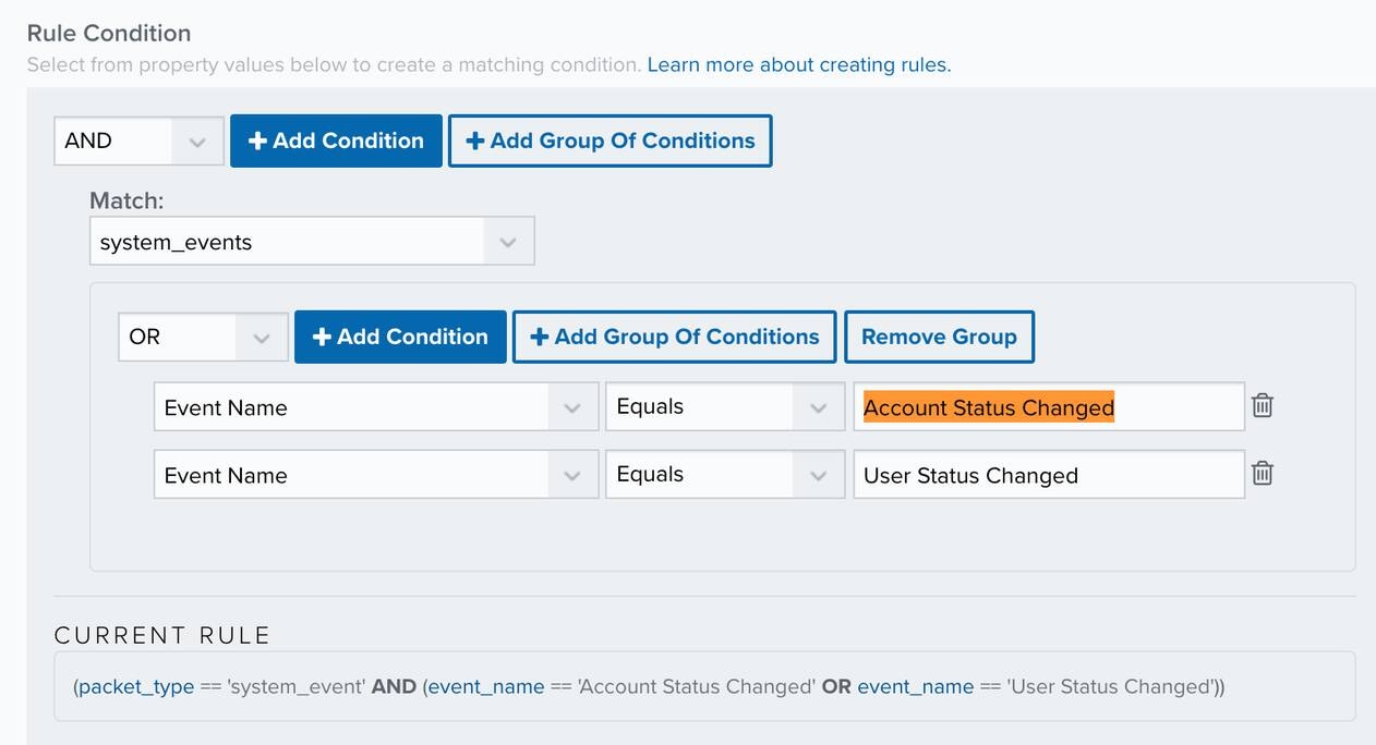Select Event Name, then Equals, and then either User Status Changed or Account Status Changed.