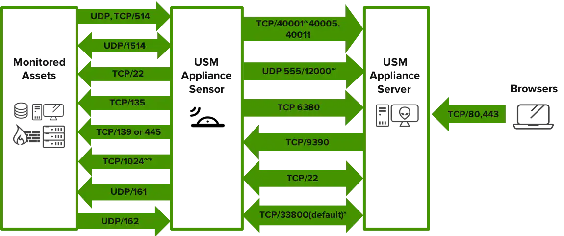 Note: If deploying USM Appliance All-in-One, you only need to open the ports associated with the monitored assets, because All-in-One includes both USM Appliance Server and USM Appliance Sensor, therefore the communication between them becomes internal.